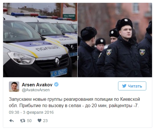 В Киевской области сегодня, 3 февраля 2016 года, начала работу новая группа реагирования патрульной полиции. Об этом в своем Twitter написал министр внутренних дел Украины Арсен Аваков.
