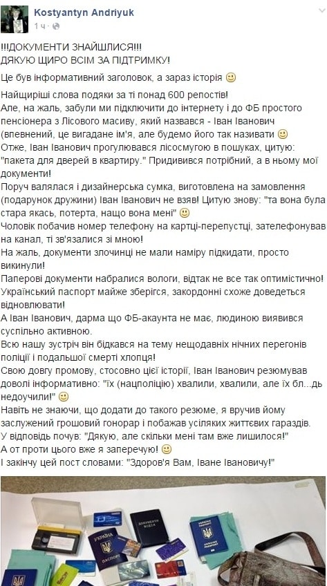 "Итак, Иван Иванович прогуливался по лесополосе в поисках, цитирую: "пакета для дверей в квартиру". Присмотрелся, нужный, а в нем - мои документы!" – сообщил Андриюк.