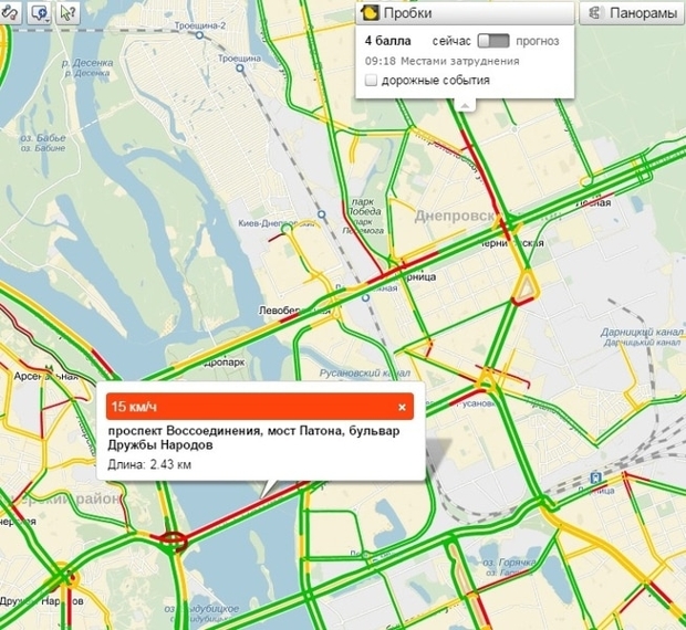По состоянию на 9:20 на мосту Патона зафиксирован дорожный затор длиной около 2,5 км. Движение транспорта затруднено в сторону правого берега.