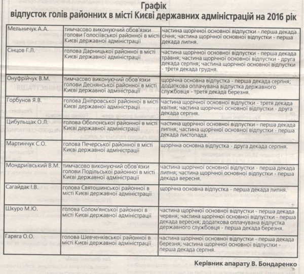 Мэр Киева утвердил график отпусков руководителей районных государственных администраций столицы.
