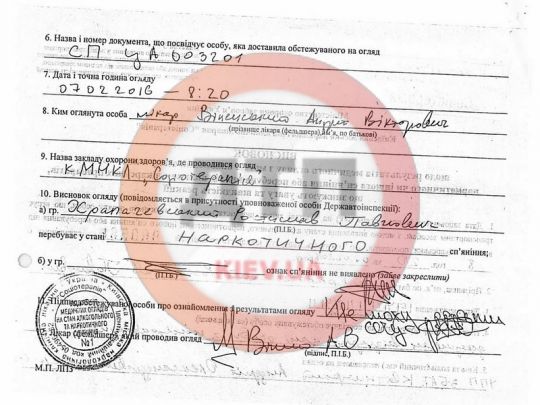 Как оказалось, парень находился в состоянии наркотического опьянения, о чем свидетельствует соответствующий документ от 07.02.2016 08:20, медицинский акт номер 000566, Киевской наркологической клинической больницы "Социотерапия".