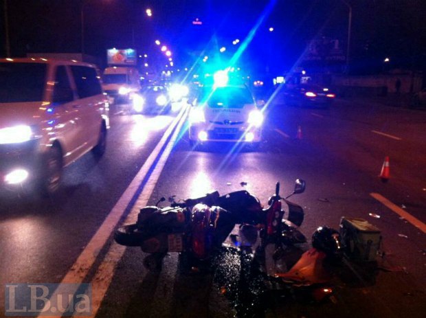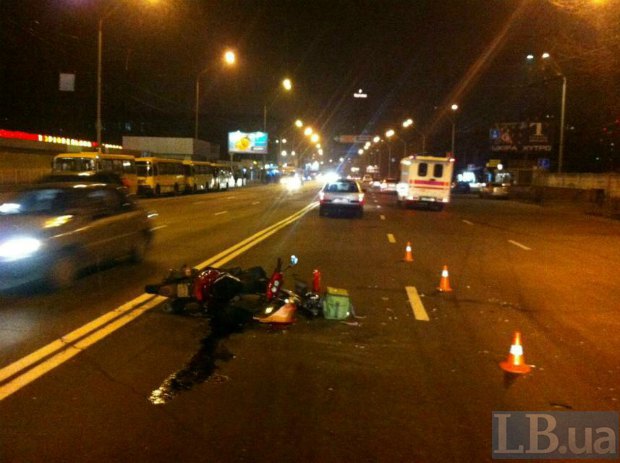 В воскресенье вечером в Киеве на улице Довженко в результате столкновения автомобиля и мотороллера пострадал водитель мотороллера.