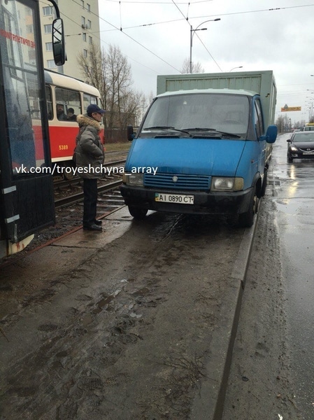 В Деснянском районе Киева утром во вторник, 23 февраля, неправильно припаркованный автомобиль заблокировал движение трамваев.