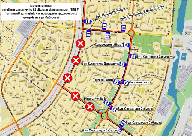 На улице Александра Сабурова на участке от улицы Оноре де Бальзака до проспекта Владимира Маяковского движение автобусов маршрута №98 будет организовано от улицы Милославской до улицы Оноре де Бальзака - по действующей схеме, далее: ул. Марины Цветаевой - просп. Владимира Маяковского - ул. Александра Сабурова, далее - по действующей схеме.