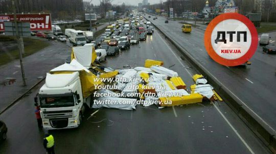 Там груз дальнобоя певернулся по всей дороге. Вероятно, груз был ненадежно закреплён.