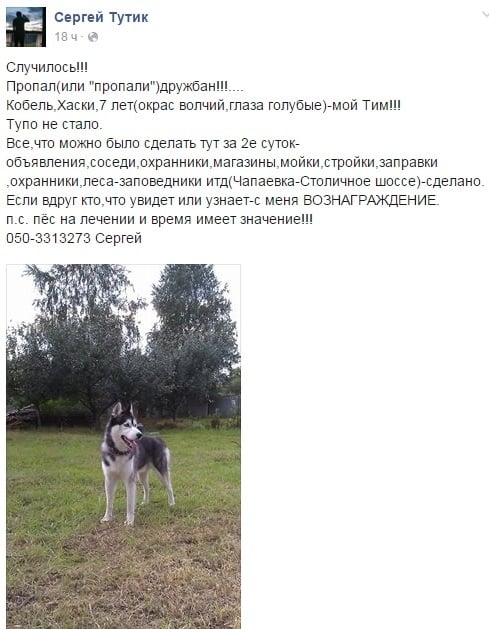 "Пропал дружбан! Кобель, хаски, 7 лет (окрас волчий, глаза голубые)", - сообщил Тутик.