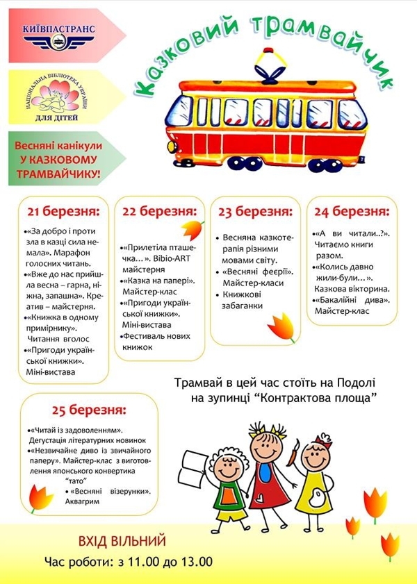 Юные киевляне смогут провести весенние каникулы вместе со сказочным трамвайчиком. Коммунальное предприятие "Киевпастранс" и Национальная библиотека Украины для детей приглашают юных киевлян в "Сказочный трамвайчик" для книжных развлечений.