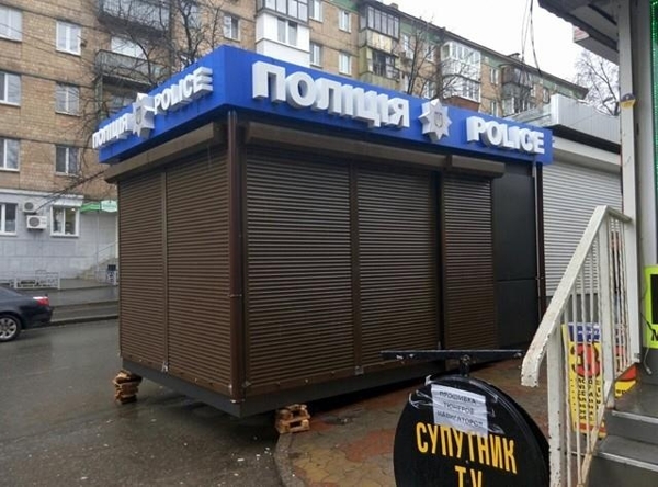 В Киеве возле железнодорожной станции "Караваевы дачи" появился необычный ларек. С виду обычный железный МАФ снабжен вывеской "Полиция".