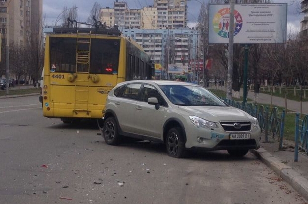 В Оболонском районе Киева произошло странное ДТП: троллейбус протаранил припаркованный внедорожник Subaru.