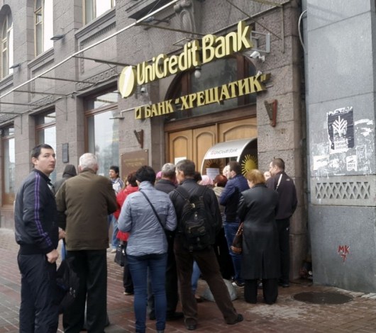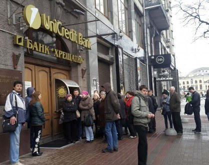 В четверг утром, 7 апреля, возле отделения банка "Крещатик" в Киеве вновь собралась толпа людей.
