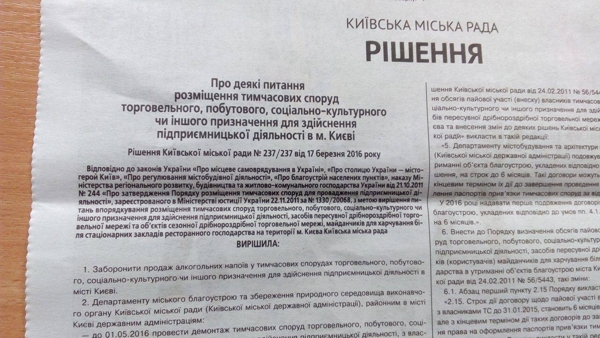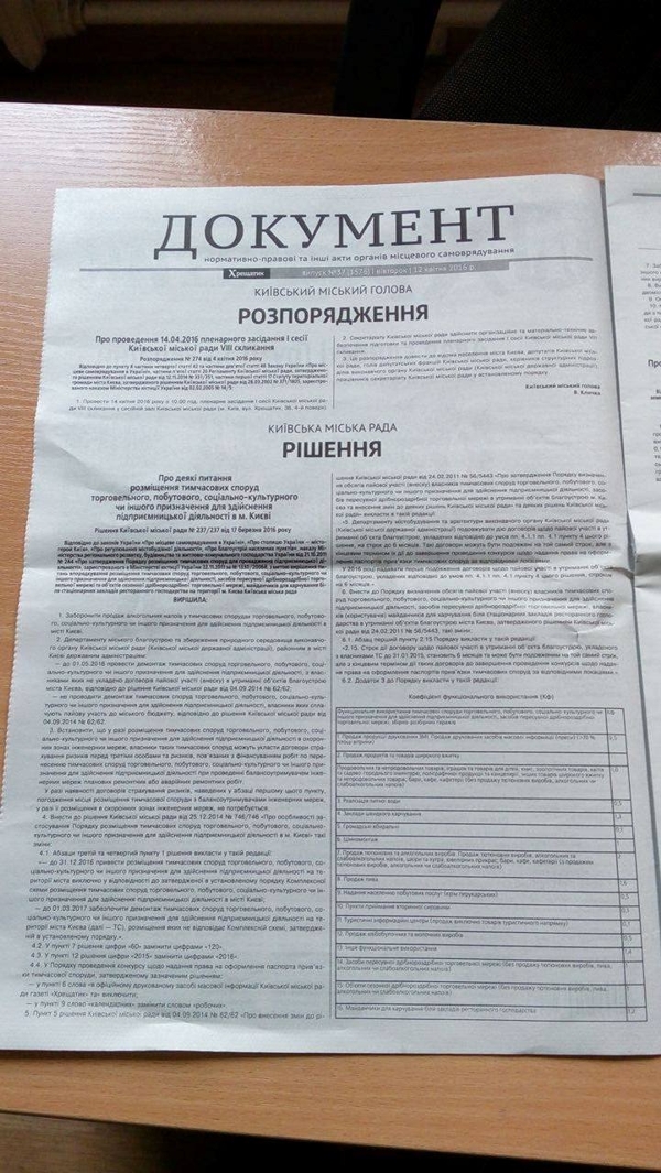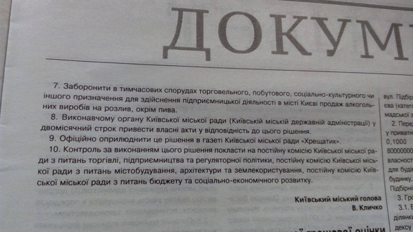 Распоряжение о запрете продажи алкоголя в киевских киосках сегодня было опубликовано в газете "Хрещатик". После опубликования оно вступает в силу.