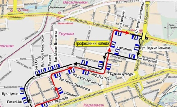 Остановка автобусов маршрутов № 2 "ПТУ" по ул.Гарматная в направлении станции метро "Шулявская".