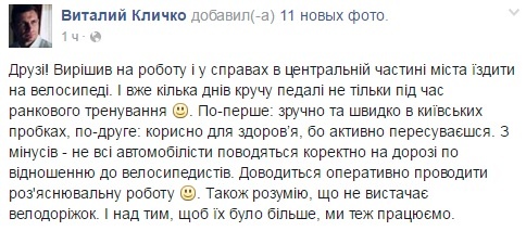 Мэр Киева Виталий Кличко сообщил в Facebook, что решил на работу и по делам в центральной части города ездить на велосипеде. "Уже несколько дней кручу педали не только во время утренней тренировки. Во-первых: удобно и быстро в киевских пробках, во-вторых полезно для здоровья, так как активно передвигаешься. Из минусов – не все автомобилисты ведут себя корректно на дороге по отношению к велосипедистам. Приходится оперативно проводить разъяснительную работу. Также понимаю, что не хватает велодорожек", – пишет Кличко.