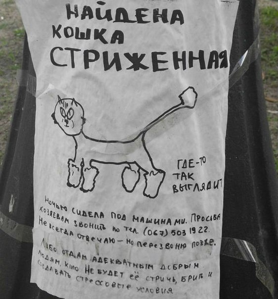 "Найдена кошка стриженная. Ночью сидела под машинами", – отмечается в тексте, где для хозяев кошки указан телефон человека, нашедшего животное.