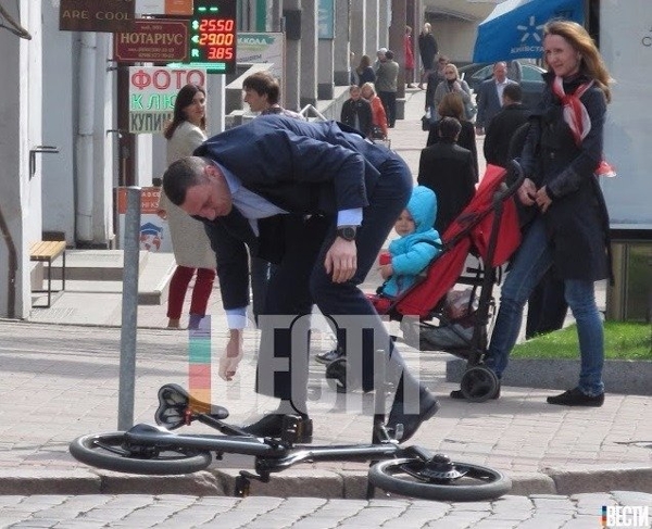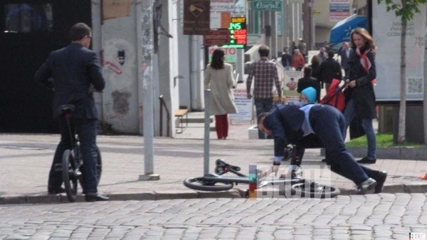 Возле перекрестка с ул. Владимирской Кличко остановился на красный свет, на зеленый он и охранник двинулись по зебре, но в конце перехода мэр решил запрыгнуть на велосипеде на бордюр. В итоге Кличко упал, перелетев через руль. Часть прохожих, которых было немало, ринулись на помощь мэру, но она не понадобилась. Он встал, отряхнулся и поехал в сторону мэрии.