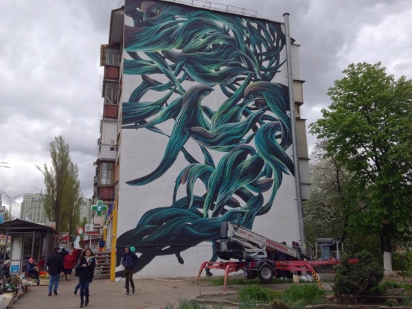 В Киеве на Севастопольской площади португальский художник Pantonio дорисовывает новый мурал. Об этом в Facebook пишет киевская журналистка Анна Устенко.