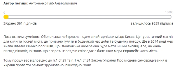 Киевляне просят отремонтировать разрушенную пешеходную зону на Оболонской набережной. Об этом идет речь в петиции Глеба Антоненко, которую он опубликовал на сайте петиций Киеврады.
