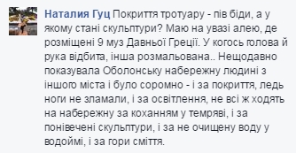 Жители столицы также отмечают, что на аллее, где размещены музы Древней Греции, у многих скульптур отбиты части, некоторые из них разрисованы. Кроме того, киевляне жалуются на недостаточное освещение, не очищенную воду и мусор на набережной.