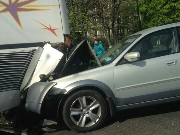 В Киеве на проспекте Науки, в районе автовокзала, автомобиль Subaru врезался в припаркованный автобус. Водитель легковушки пострадал.