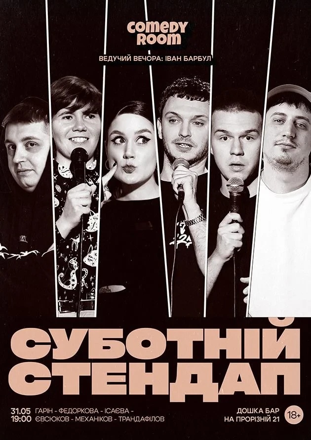 Comedy Room запрошує на вечір стендапу 31 травня. Ведучий – Валентин Барбул, а виступатимуть коміки: Микита Гарін, Катерина Федоркова, Микита Механіков, Аліса Ісаєва, Євген Євсюков, Нікіта Трандафілов. Буде доступний бар, жарти та сміх.