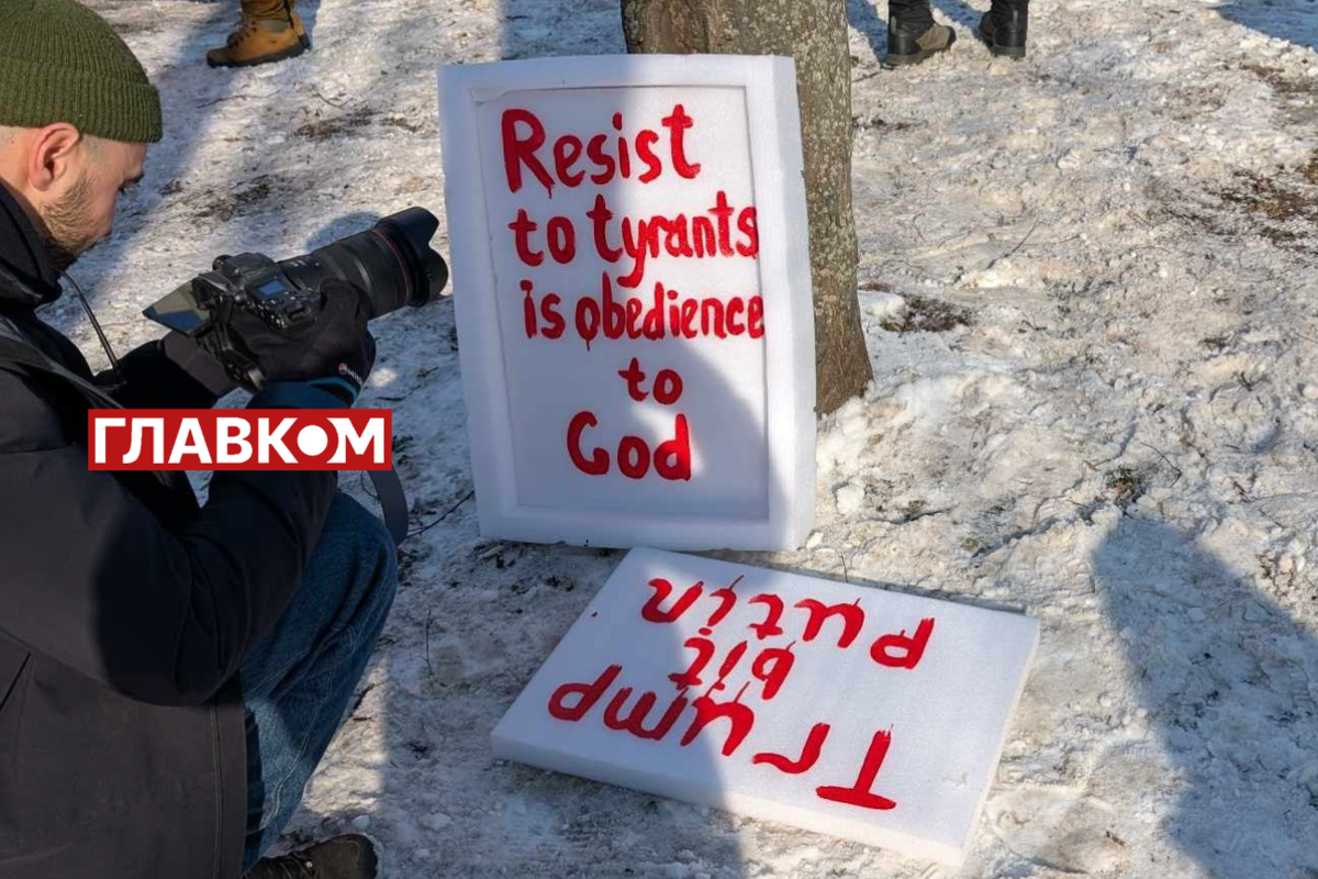 Громадяни, які прийшли на акцію, поводяться спокійно, вони тримають плакати, на яких написано: «США – не дорівнює Трамп», «Україна – не резервація».