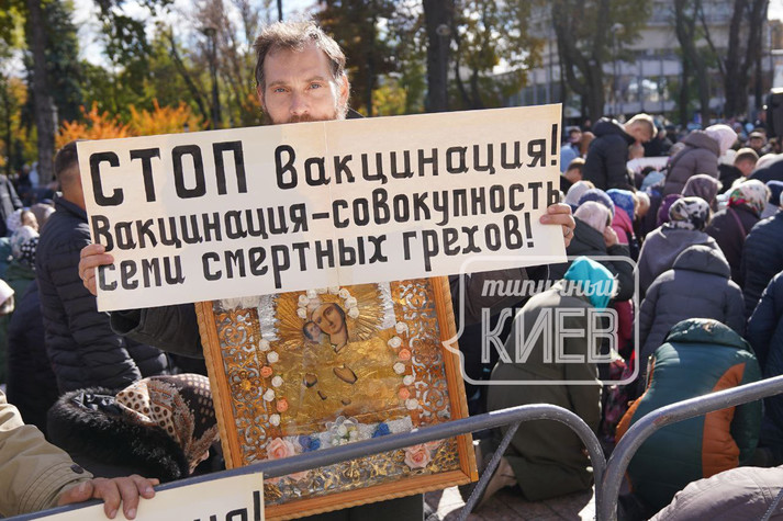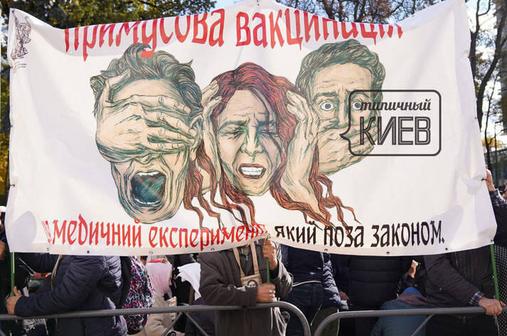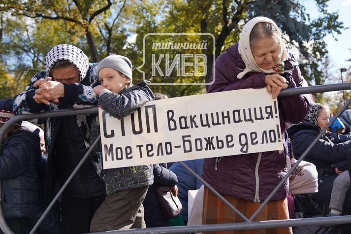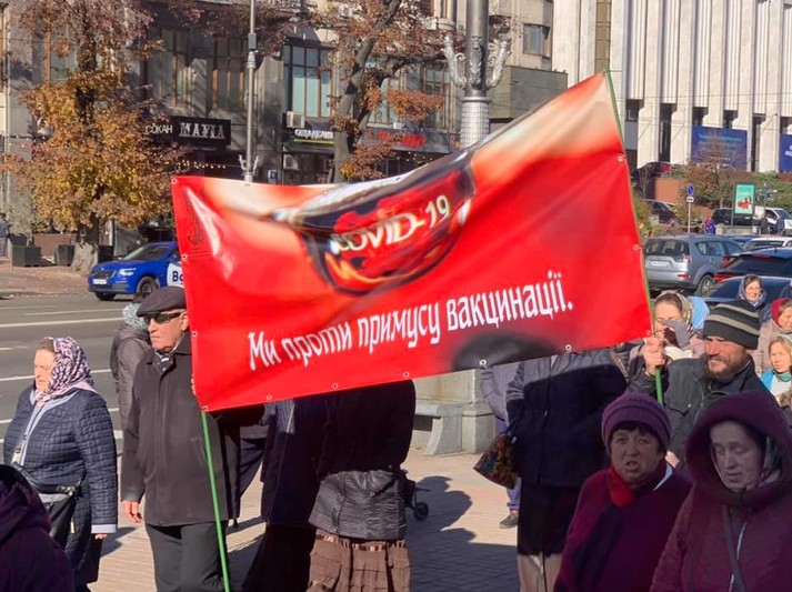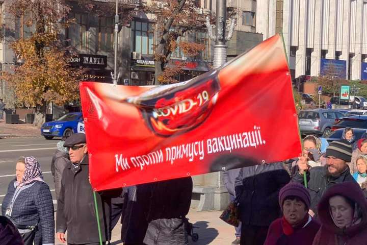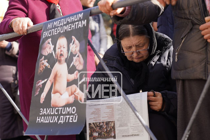 Люди стоять із плакатами, на яких, зокрема написано «Примусова вакцинація – це геноцид», «Примусова вакцинація – це медичний експеримент, який поза законом», «Стоп вакцинація! Вакцинація – сукупність семи смертних гріхів», «Стоп вакцинація! Моє тіло – боже діло!» тощо.