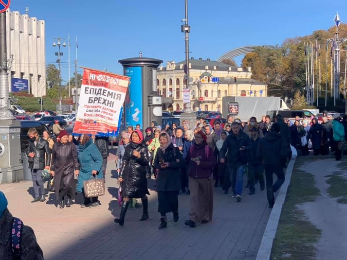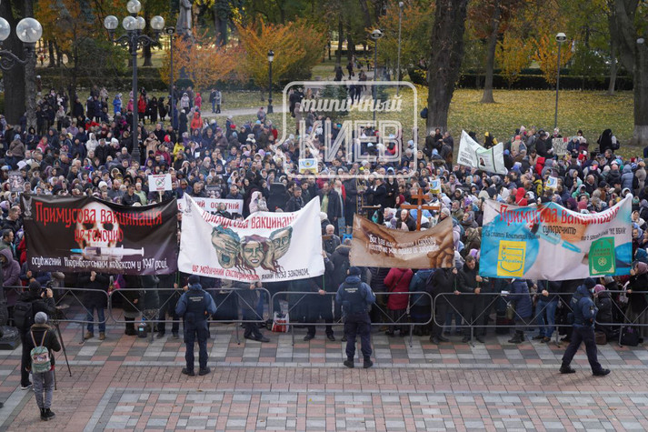 Противники вакцинації колоною пройшли центром Києва, зупинилися біля будівлі столичної мерії, далі рушили до Майдану Незалежності та вулицею Грушевського піднялися до будівлі парламенту.