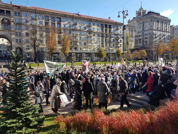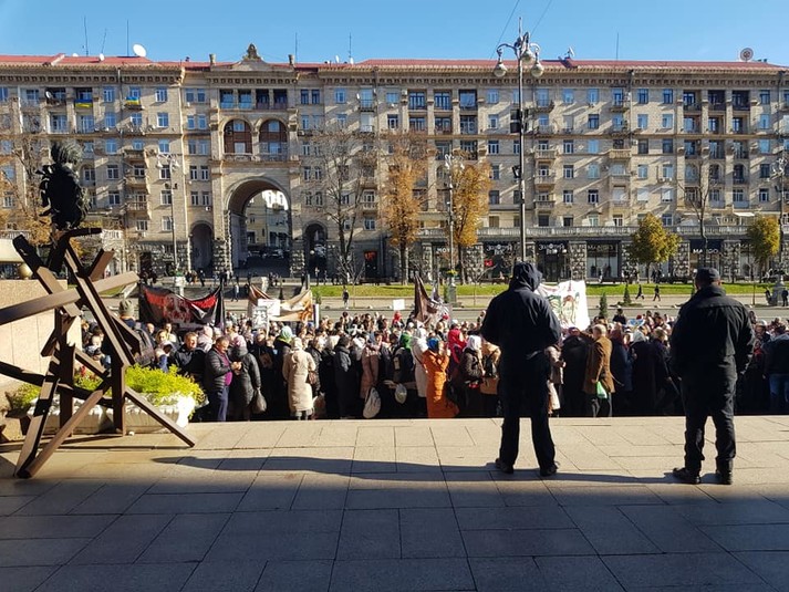 Серед мітингувальників переважно люди похилого віку. Всі вони без захисних масок. Дехто тримає в руках церковні хрести, ікони.