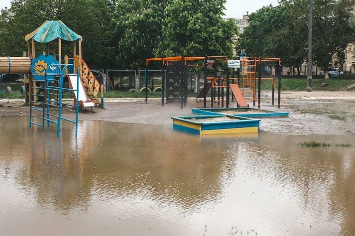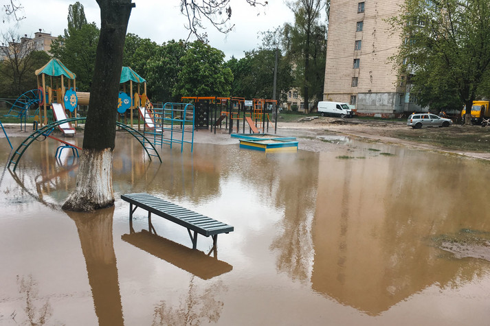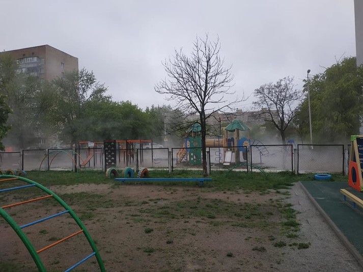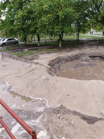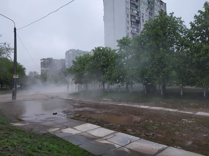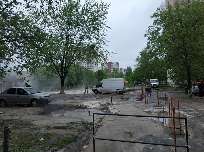 У четвер, 2 травня, на вулиці Симиренка, 7 в Києві прорвало трубу гарячого водопостачання. Через аварію дитячий майданчик затопило окропом, а машина, яка стояла на парковці у дворі, провалилася під асфальт.