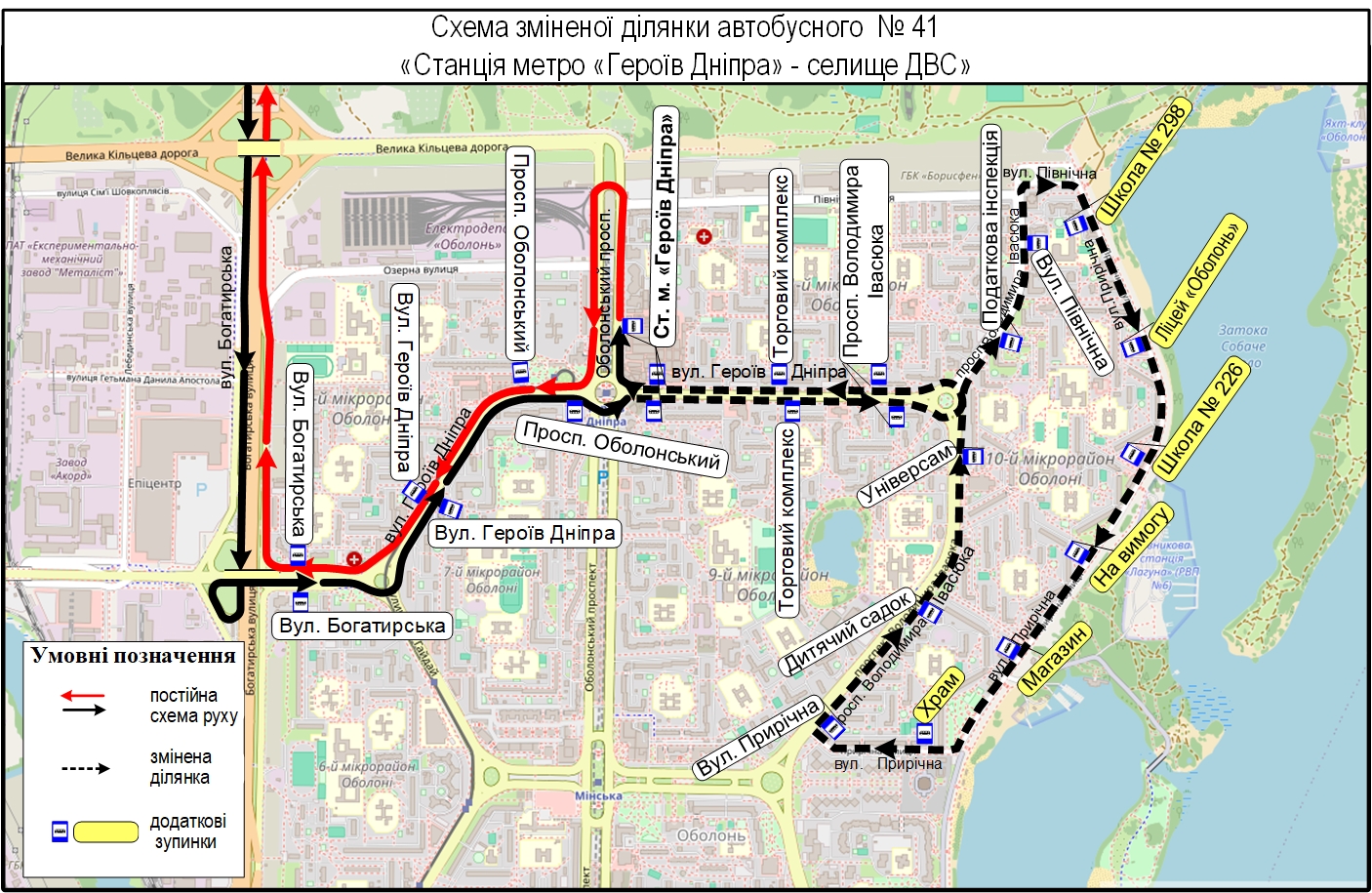 Варто звернути увагу, що у зворотному напрямку (від метро «Героїв Дніпра» до селища ДВС) автобуси курсуватимуть без змін.