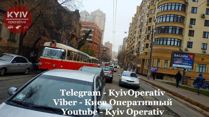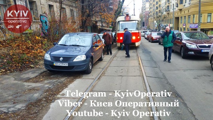 Сьогодні, 20 листопада, на вулиці Дмитрівській у Києві автомобіль Renault заблокував рух трамваїв №15 і 18 у напрямку станції метро «Контрактова площа».