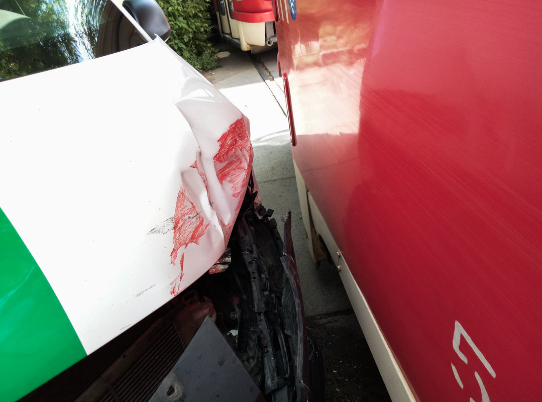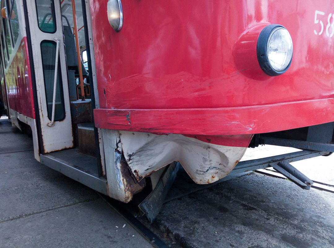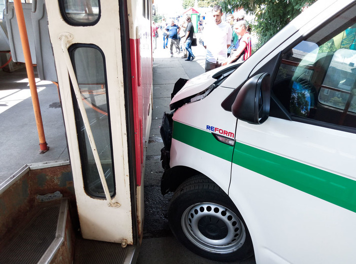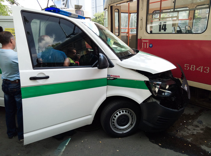 Трамвай ударив Transporter в ліву сторону і розбив всю передню частину машини. У трамвая розбита передня права сторона.