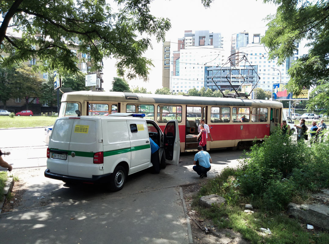 Водій інкасаторської машини Volkswagen Transporter від'їжджав від відділення Idea Bank. Автомобіль виїжджав з пішохідної зони на проїжджу частину. Для цього необхідно було перетнути трамвайні колії. Через рослинність, розташовану на виїзді, огляд водія був обмежений. Він не встиг зреагувати на трамвай, що рухався з боку станції метро «Лук'янівська» в напрямку станції метро «Берестейська», і сталося зіткнення.