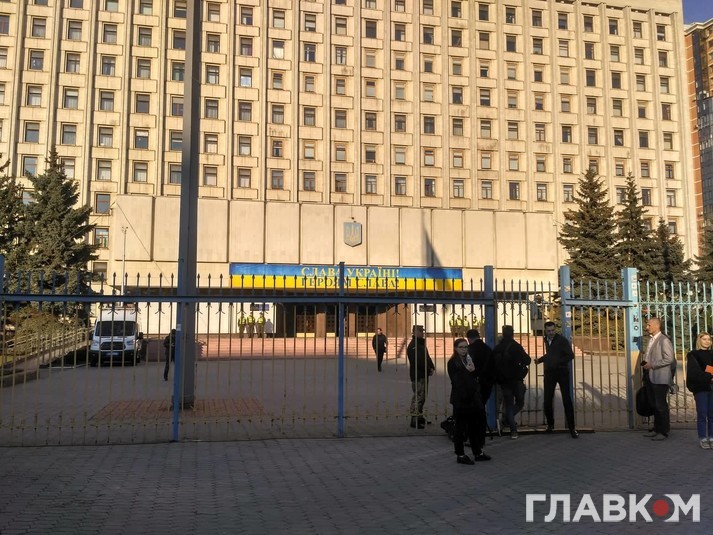 Біля будівлі Центральної виборчої комісії в Києві 31 березня, в день виборів президента України, зібралися близько 50 невідомих людей.