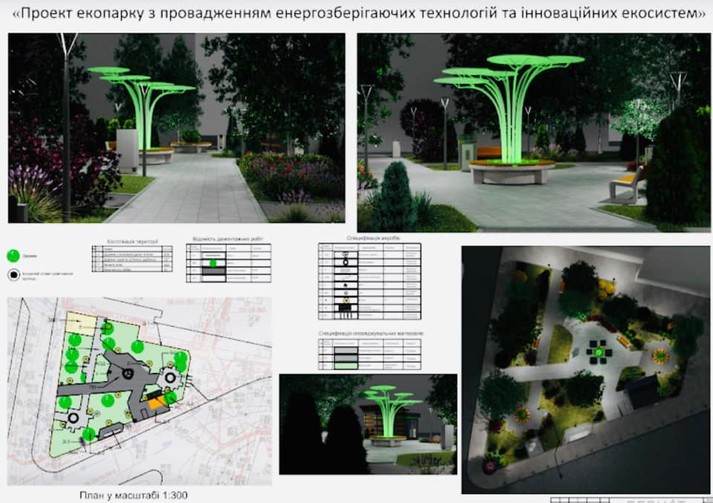 «Лавки, смітники, покриття для доріжок до їх складу входитимуть елементи з перероблених відходів. Енергоефективність парку - там будуть встановлені сонячні батареї для вуличного освітлення, зарядні станції на основі відновлювальних джерел енергії тощо», - повідомив Гаряга.