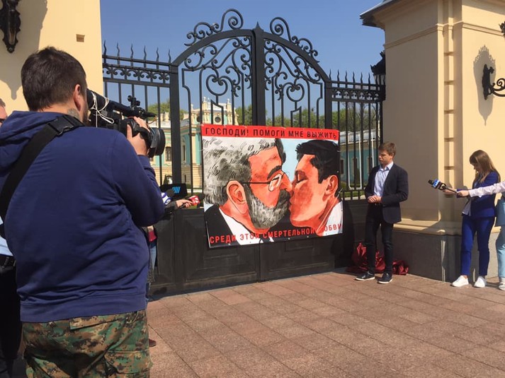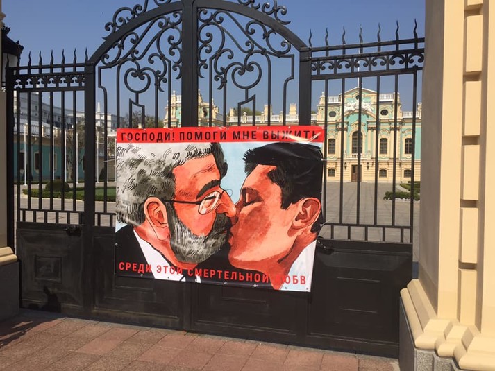 Сьогодні, 24 квітня, на воротах біля Маріїнського палацу в центрі Києва з’явилася картина з поцілунком Володимира Зеленського та Ігоря Коломойського.