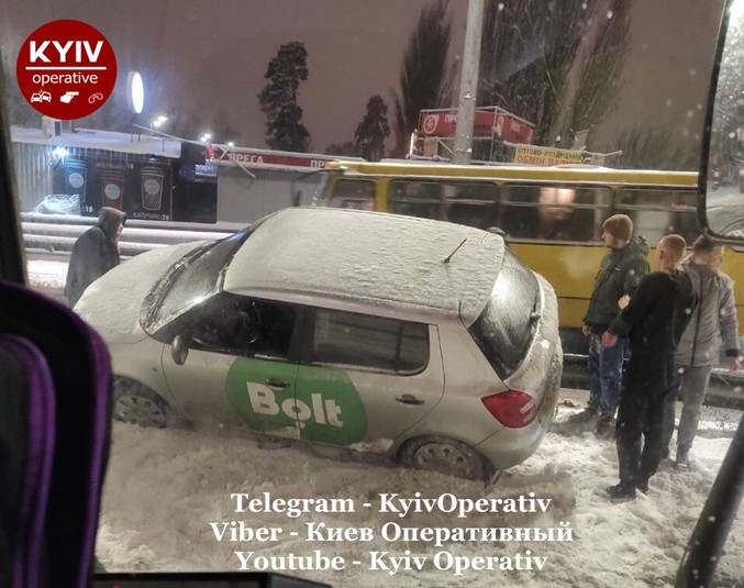 Як повідомляється на сторінці «Київ оперативний» у Facebook, водій Skoda служби таксі Bolt вирішив розвернутися через трамвайні колії та налетів на відбійник.
