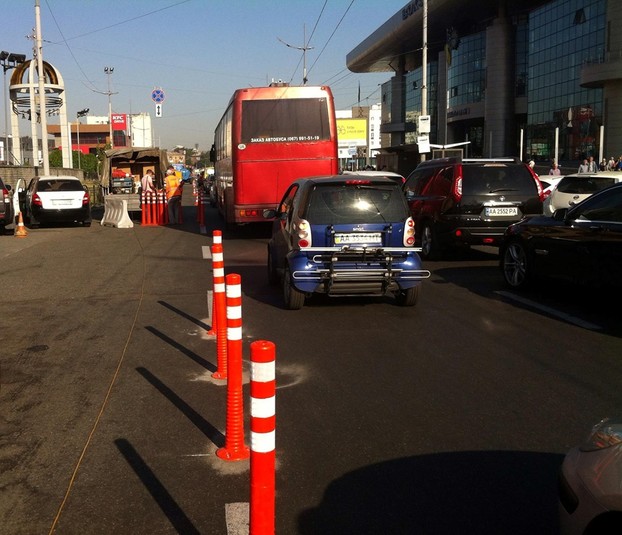 У Києві на вул. Ползунова біля Південного залізничного вокзалу встановлено розмежувальні стовпчики (делініатори). Про це повідомляє КП «Центр організації дорожнього руху».
