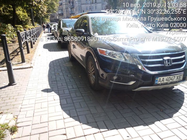 Біля Верховної Ради на вулиці Грушевського у Києві водії масово порушують ПДР, паркуючи свої автомобілі на пішохідній доріжці.