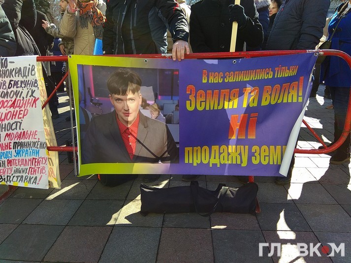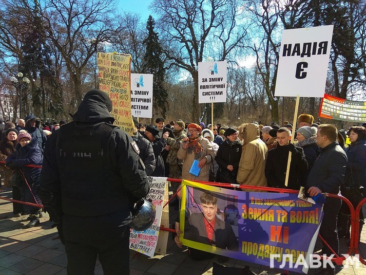 Інші мітингарі тримають гасла «Надія є», «В нас залишились тільки земля і воля» та «я за зміну політичної системи». Близько 10:30 біля Ради з'явилась Надія Савченко та її 50 соратників. Вони вимагають, щоб Надії Савченко недоторканність не знімали. Між мітинугвальникими та прихильниками Савченко виникли легкі сутички, люди лаялись між собою та сперечались.