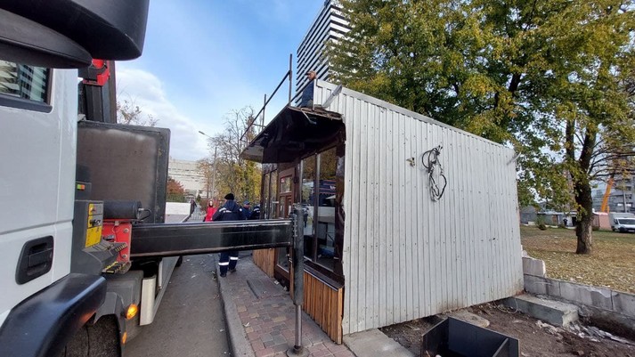 21 жовтня на проспекті Академіка Глушкова навпроти Національного комплексу «Експоцентр України» біля станції метро «Виставковий центр» завершився демонтаж понад 40 тимчасових споруд, що розміщувалися без дозвільних документів. На місці демонтованих МАФів планується якнайшвидше відновити благоустрій та висадити зелені насадження. Про це повідомив перший заступник голови Київської міської держадміністрції з питань здійснення самоврядних повноважень Олексій Кулеба.