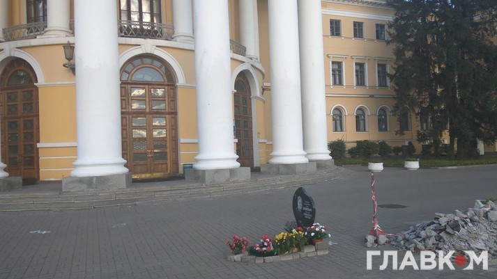 Невеличкий пам’ятник облаштували напроти входу до будівлі. Біля нього стоять штучні та живі квіти.
