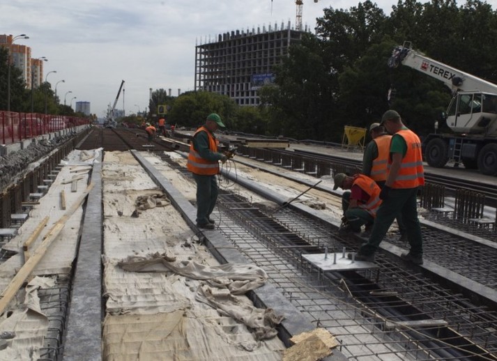 Зазначається, що на початок серпня вже виконані роботи з бетонування монолітної плити трамвайної частини на двох прогонах та частково автомобільного проїзду.