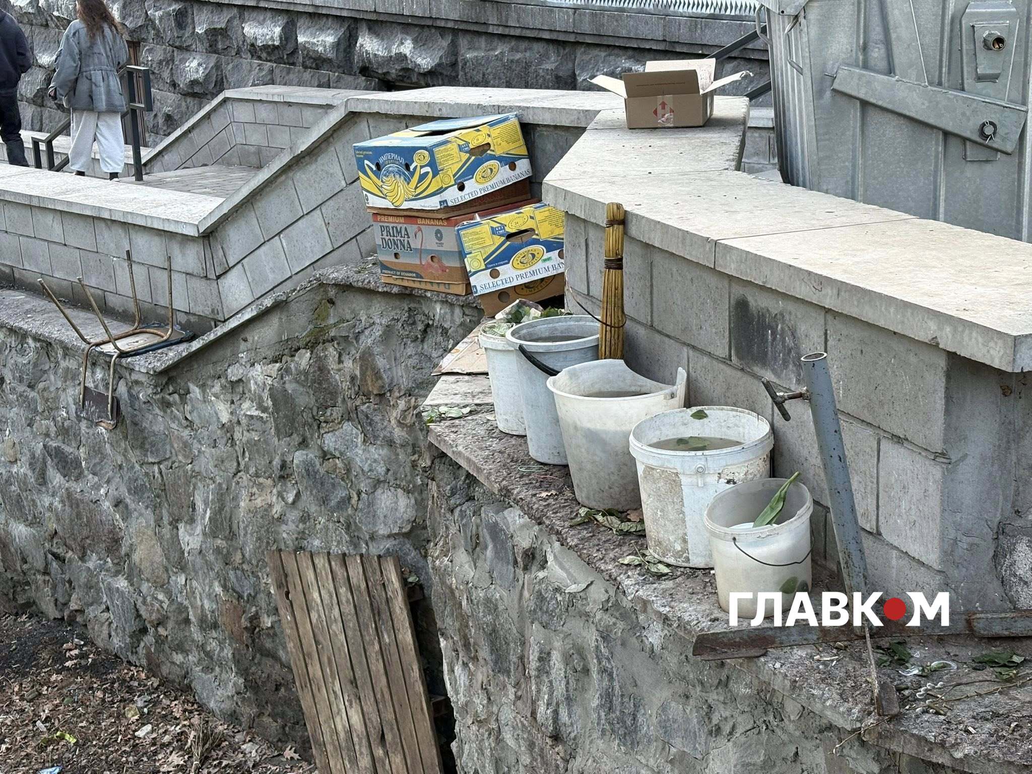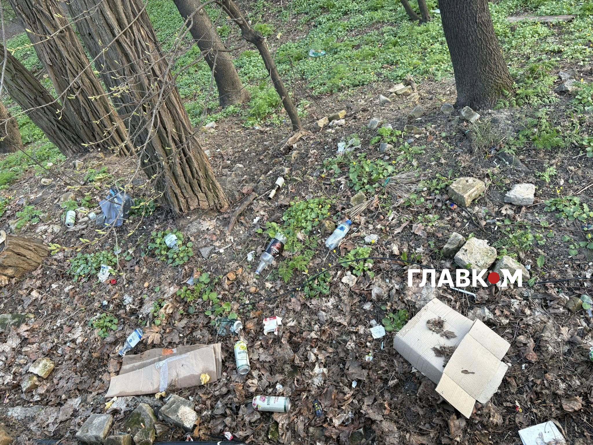 Однак контраст із красою квітів стає помітним уже біля огорожі саду. Оглянувши ділянку від центрального входу біля метро «Університет» і вздовж паркану в напрямку червоного корпусу університету імені Тараса Шевченка, можна побачити далеко не взірцеву картину. Через металеву сітку проглядають купи неприбраного торішнього листя, перемішаного з побутовим сміттям: пластиковими пляшками, залишками їжі та ящиками.