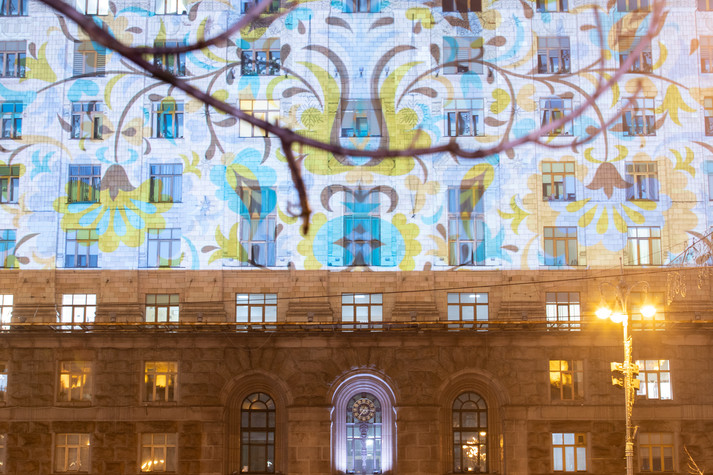 Підсвічення будівлі КМДА кримськотатарським орнаментом Орьнек, включеним до списку світової спадщини ЮНЕСКО