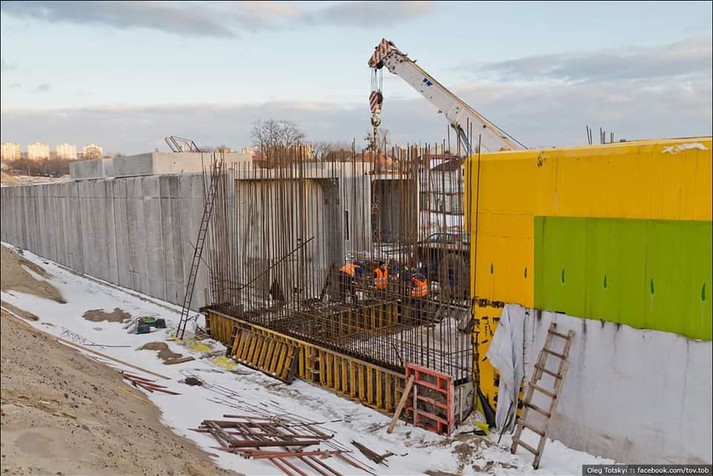 На Русанівських садах у Дніпровському районі Києва триває будівництво метро, зокрема там монтують гермозатвори. Про це повідомив київський блогер Олег Тоцький, оприлюднивши кілька світлин з будівництва.