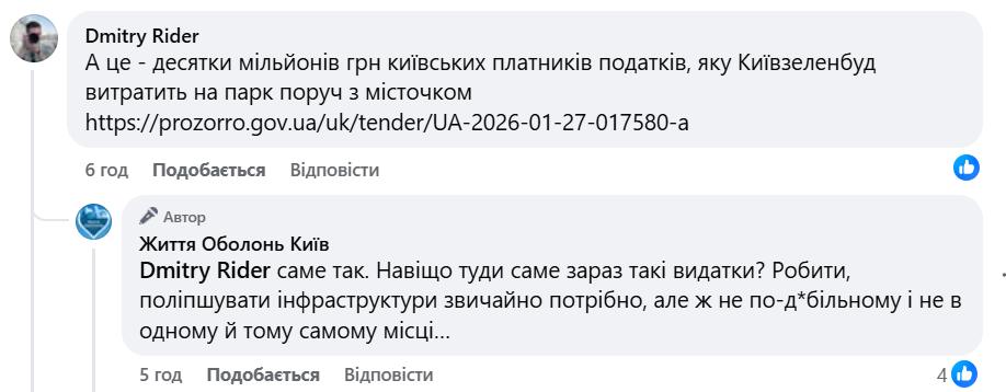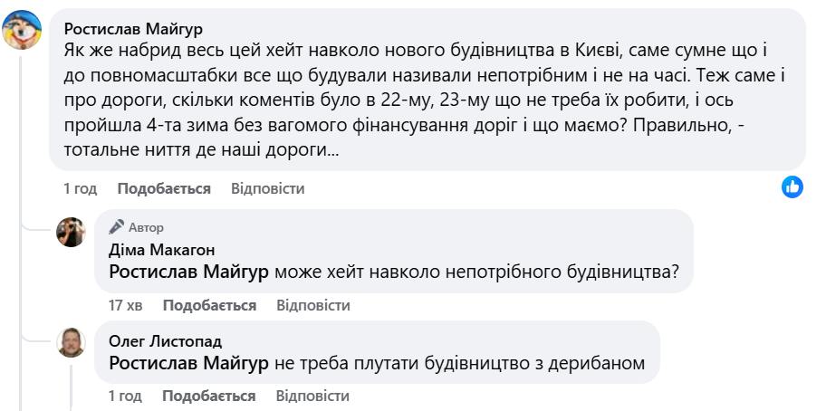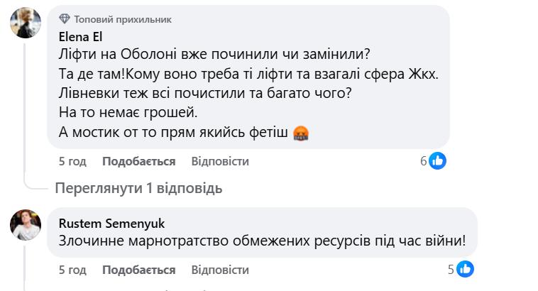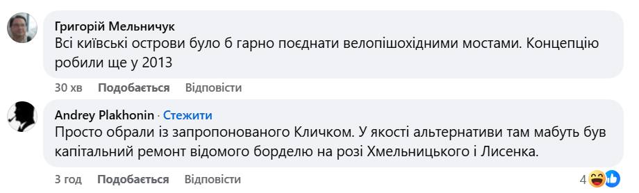 Коментарі під дописами Макагона та Вітренка традиційно розділилися. Частина користувачів підозрює «міжнаціональний розпил» та висміює любов мера до урочистих перерізань стрічок. Проте знайшлися і захисники будівництва. Зокрема, деякі кияни зазначають, що хейт навколо нових об’єктів був і до повномасштабної війни, а відсутність фінансування інфраструктури (зокрема доріг) з часом призведе до ще більшого «ниття» мешканців.