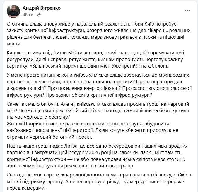 Вітренко зауважив, що навіть якщо гроші надає Литва, це все одно ресурс довіри міжнародних партнерів України і витрачати цей ресурс у 2026 році на лавочки, парк і міст замість критичної інфраструктури не можна.