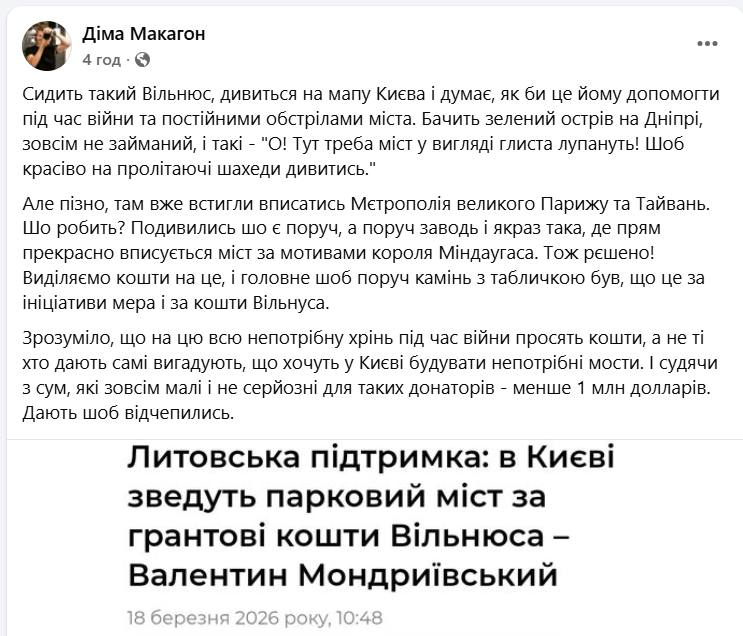 «Сидить такий Вільнюс і думає, як би допомогти під час війни... О! Тут треба міст у вигляді глиста лупануть! Шоб красіво на пролітаючі шахеди дивитись», – пише Макагон.