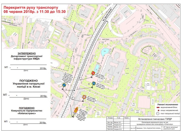 - із 11:30 до 15:30 – траса Е95 від просп. Голосіївського, 15 у напрямку Деміївської площі, 1 (дві праві смуги); траса Е95 від просп. Голосіївського, 15 у напрямку просп. Науки;